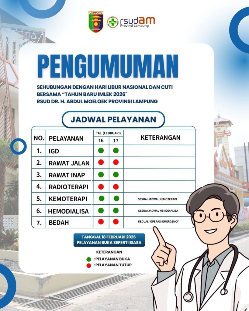 Media Rilisan Bangsa,Bandar Lampung, 14 feb 2026– Dalam rangka Hari Libur Nasional dan Cuti Bersama Tahun Baru Imlek 2026, RSUD Dr. H. Abdul Moeloek Provinsi Lampung menetapkan penyesuaian jadwal pelayanan pada tanggal 16–17 Februari 2026.